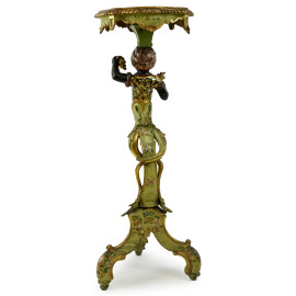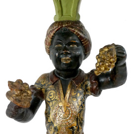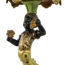 Gueridon in legno intagliato, laccato e dorato, Venezia, XIX secolo, piano sagomato a lacca rossa sorretto da moro con grappolo d'uva e fiori, base a tripode, cm h 94
