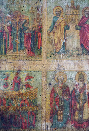Icona greca quadripartita con scene bibliche, stampa applicata su tavola, cm 35,5x29, XX secolo, (difetti).