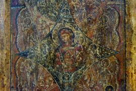 Icona Madre di Dio del roveto ardente, Russia, fine XVIII- inizi XIX secolo, tempera su tavola, cm 32x24, (difetti e restauri).