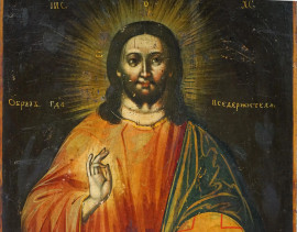 Icona raffigurante Cristo Pantocrator, Russia, fine XVIII secolo, tempera su tavola, cm 26,5x22,5, (lievi difetti).