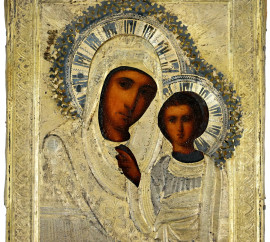 Icona raffigurante Madonna con Bambino, Russia, fine XIX secolo, tempera su tavola, riza in argento dorato, cm 18,5x14, (difetti).