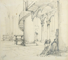 Inerno di cattedrale con figure, disegno a matita su carta, cm 10,5x11,5, firmato G. Carelli