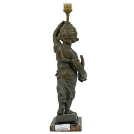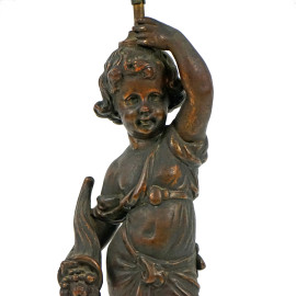 Lampada da tavolo in bronzo brunito a forma di putto con cornucopia, base in marmo, cm h 51, XX secolo, (difetti)