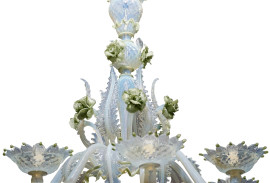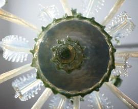 Lampadario in vetro di Murano opalescente, 8 bracci a volute, fiori e particolari in pasta vitrea verde, alt. cm 100, diam. cm 80.
