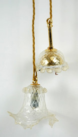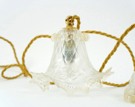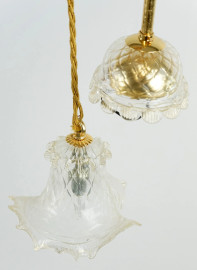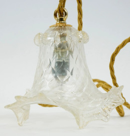 Lotto composto da quattro coppie di lampadine a sospensione in vetro di Murano con inclusioni dorate, sostegno in corda, misure max cm 127, XX secolo, (fili elettrici recisi, difetti).