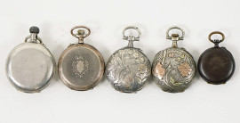 Lotto di cinque orologi da tasca con casse in argento e metallo argentato, XIX secolo, diam max cm 3,5, (meccanismi da revisioanre)