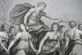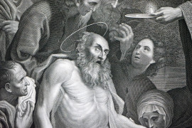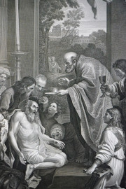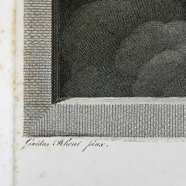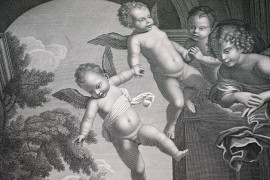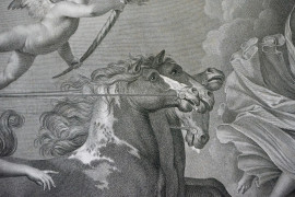 Lotto di due incisioni da Guido Reni (1575-1642) e Domenichino (1581-1641) raffiguranti "Aurora conduce il Carro del Sole" e "Comunione di S. Girolamo", misure max cm 97,5x67,5, XIX-XX secolo, (difetti e macchie sulla carta).