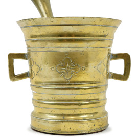 Lotto di due mortai con pestello in bronzo ed ottone, alt. max cm 14, epoche diverse, (segni del tempo).