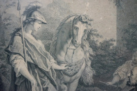 Lotto di due stampe raffiguranti "Erminia e i pastori" e "Fiaccole di Nerone", epoche diverse, misure max cm 51,5x35, entro cornici, (difetti)