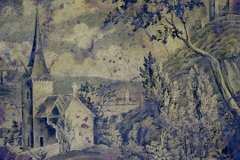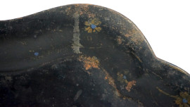Lotto di due vassoi laccati in rame di linea quadrata e sagomata, un decoro raffigurante fortezza di Lanheck in Germania, misure max cm 63X47,5, (difetti).