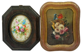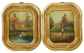 Lotto di quattro miniature dipinte ad olio raffiguranti paesaggi lacustri con figure e fiori, supporti diversi, misure max cm 11x8, firmate, entro cornici, (lievi difetti)