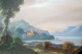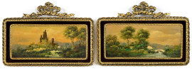 Lotto di tre miniature dipinte ad olio raffiguranti paesaggi, supporti diversi, misure max cm 17x24, entro cornici in legno e metallo dorato