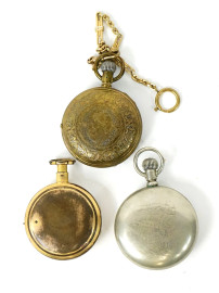 Lotto di tre orologi da tasca, con casse in metallo argentato e dorato, XIX-XX secolo, diam. max cm 6, (meccanismi da revisionare)