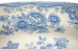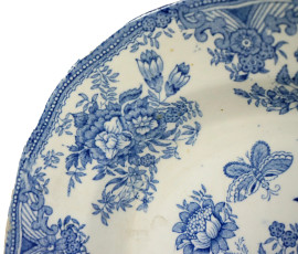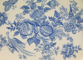 Lotto di tre vassoi in maiolica bianco e blu a decoro di fiori e volatili, Inghilterra, inizi XX secolo, misure max cm h 4x41x32,5