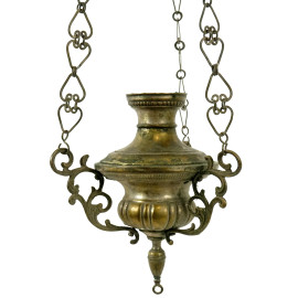Lume votivo in metallo dorato, alt. cm 60 circa, XX secolo, (difetti).
