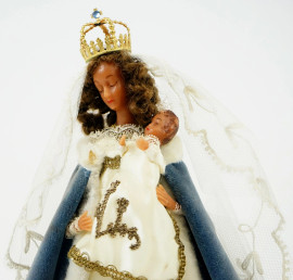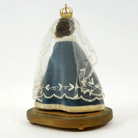 Madonna col Bambino, scultura in cera con vesti in stoffa, entro campana in vetro, prima metà XX secolo, cm h 26