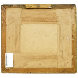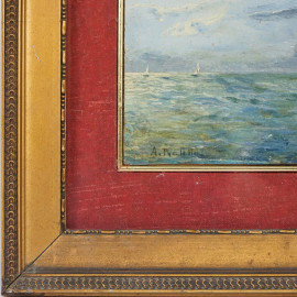Marina con imbarcazioni, olio su cartone, cm 14x16, firmato, entro cornice.