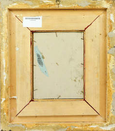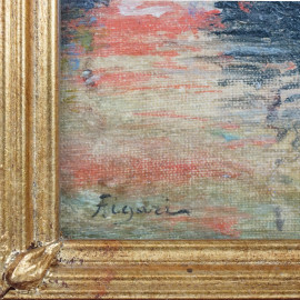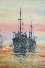 Marina con navi, olio su tela riportata su cartone, cm 21x16, firmato, entro cornice.