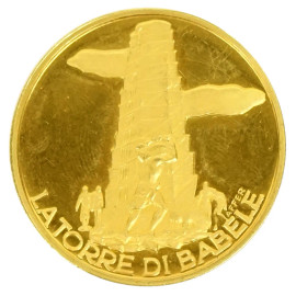 Medaglia in oro giallo raffigurante al recto La Bibbia, al verso la Torre di Babele, diam. cm 3, peso gr.15,1