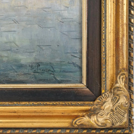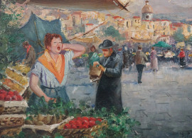 Mercato, olio su compensato, cm 25x35, firmato, entro cornice.