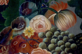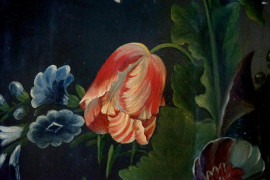 Natura morta - fiori con uccelino e nido, olio su rame, cm 67x54, XX secolo, entro cornice