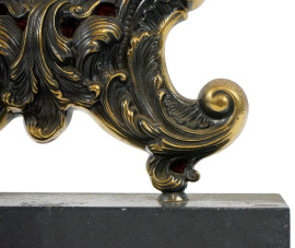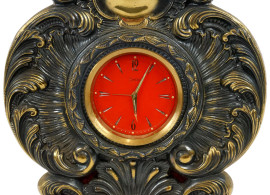 Orologio da tavolo 8 Giorni, Swiza XX secolo, quadrante circolare a fondo rosso, applicato su pannello in metallo dorato con decori a volute, base in marmo, cm h 43x28x7,5, (meccanismo da revisionare)