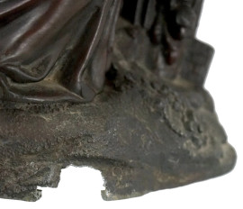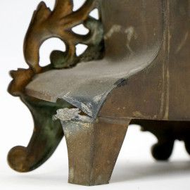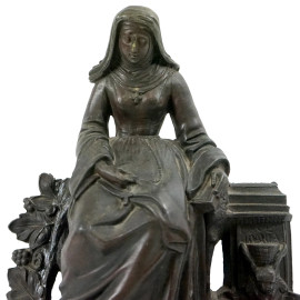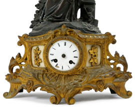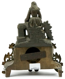 Orologio da tavolo in antimonio, prima metà del XX secolo, sormontato da figura in preghiera, quadrante circolare a numeri romani, cm h 40x37x13, (mancanti lancette, difetti, meccanismo da revisionare)