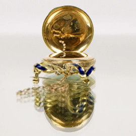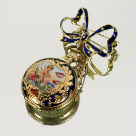 Orologio monachina cassa in oro 14 kt e spilla a forma di fiocco in oro 18 kt, decoro a smalti policromi raffigurante putto con farfalle, diam cm 2,8, (lievi difetti, meccanismo da revisionare)