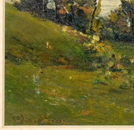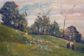 Paesaggio collinare con figure, olio su tavola, cm 15x20,5, firmato e datato, entro cornice.