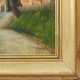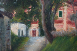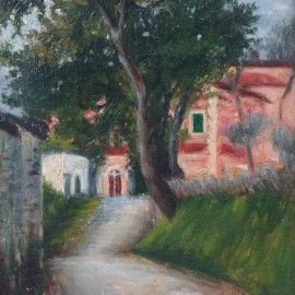 Paesaggio con albero e case, olio su tavola, cm 32x21, firmato, entro cornice.