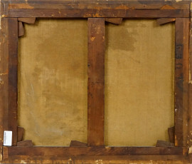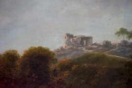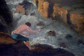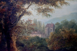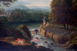 Paesaggio con pescatore e figure lungo il fiume, olio su tela, cm 63x76, fine XVIII-inizi XIX secolo, entro cornice, (difetti).