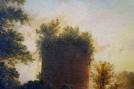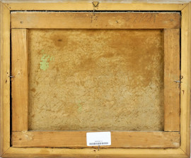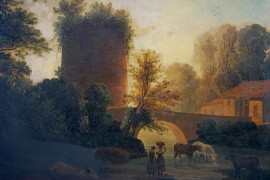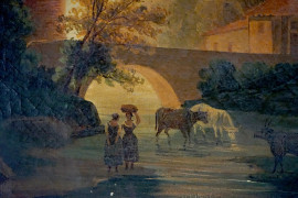 Paesaggio con ponte e figure, olio su tela, cm 32x40, XIX secolo, entro cornice