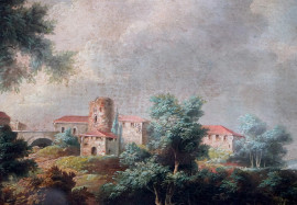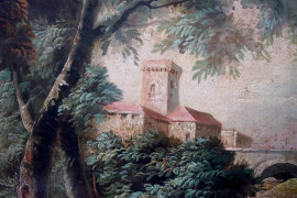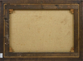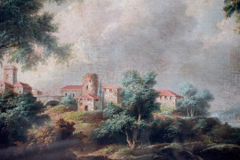 Paesaggio lacustre con figure, olio su tela, cm 70x100, XIX secolo, entro cornice.
