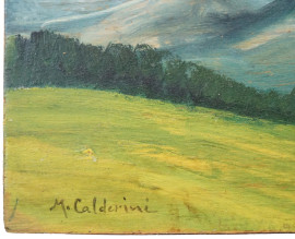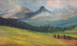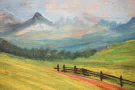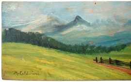Paesaggio montano, olio su tavola, cm 12x28, firmato, entro cornice.