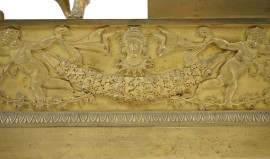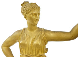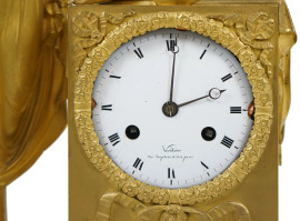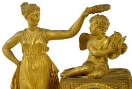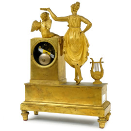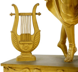 Pendola da tavolo in bronzo dorato e cesellato, Francia, XIX secolo, quadrante a numeri romani affiancato da Allegoria della Musica con cherubino, poggiante su base con decori a rilievo, cm h 50x35,5,x13, (difetti, meccanismo da revisionare).