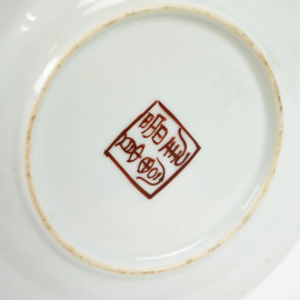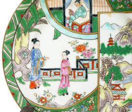 Piattino in porcellana policroma, decoro raffigurante scene di genere, diam. cm 17, arte orientale, XX secolo