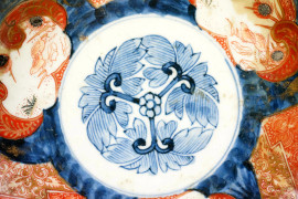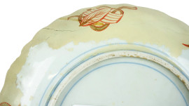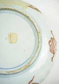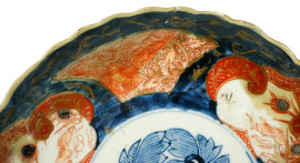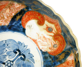 Piatto in porcellana Imari, decorato con motivi floreali in tre colori, blu, rosso e oro, diam. cm 21,5, XX secolo, (difetti ed un restauro).