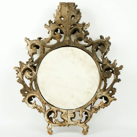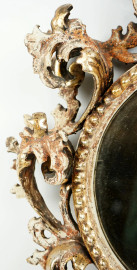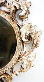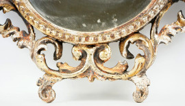 Piccola specchiera fiorentina in legno intagliato e dorato, cornice scolpita a foglie d'acanto, cm 48,5x39, (difetti).