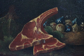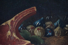 Pittore del XVII secolo,Tavola imbandita con carne e fichi, olio su tela, cm 37x48, entro cornice.