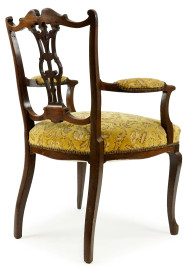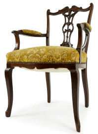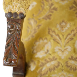 Poltroncina in noce, fine XIX secolo, parti scolpite ed intagliate, seduta e schienale imbottiti e rivestiti in velluto, cm h 91x54x51, (difetti)