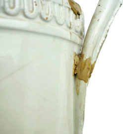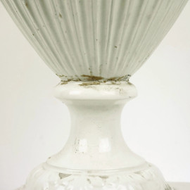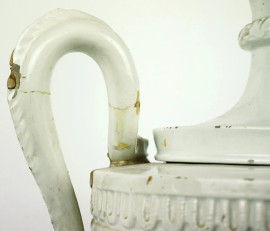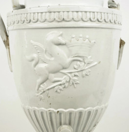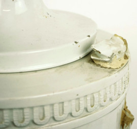 Potiche in maiolica bianca, XIX secolo, con decoro a rilievo, cm h 61, (difetti, restauri e mancante una presa)