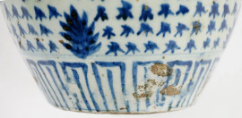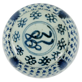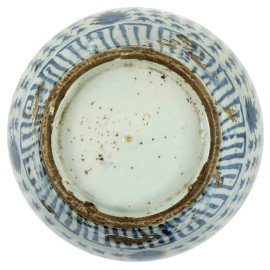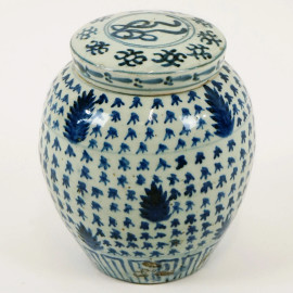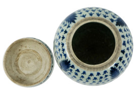 Potiche in porcellana bianca e blu, arte orientale, XX secolo, cm h 18,5, (difetti)
