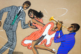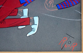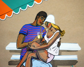 Quattro scene dipinte a tecnica mista su carta raffiguranti coppie di innamorati con cagnolini, ingombro max cm 23,5x84,5, firmati e siglati in basso a destra, entro un'unica cornice.