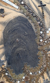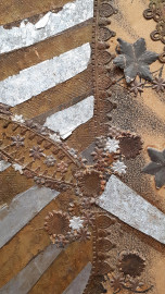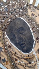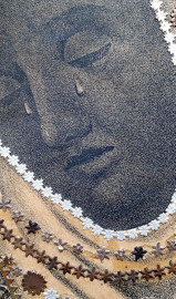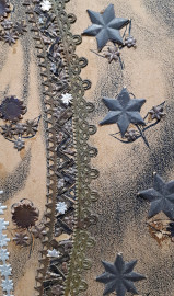 Rara immagine votiva in cromolitografie e inserti di stelle in metallo, fiori in pelle e altri preziosismi a rilievo su cartone, cm 51x39