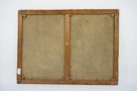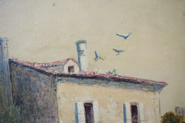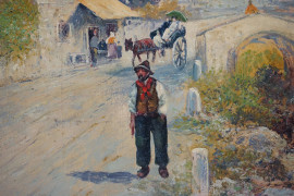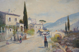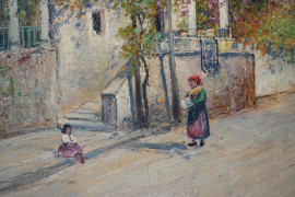 Scorcio di paese con figure, olio su tela, cm 74x100, inizi XX secolo.