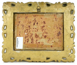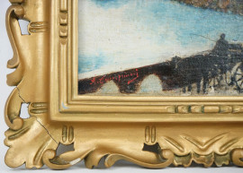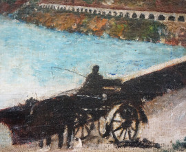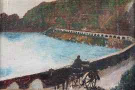 Scorcio lacustre con carrozza, olio su cartone, 18x24, firmato, entro cornice.
