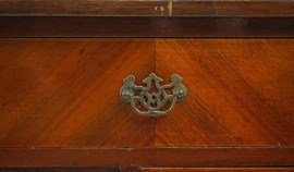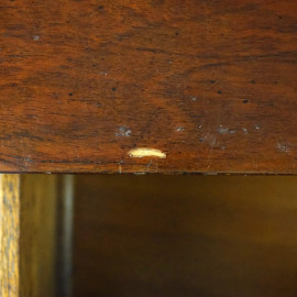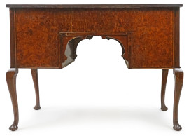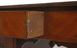 Scrivania da centro in radica di noce, Inghilterra, fine XIX secolo, con quattro cassetti sottostanti, gambe di linea mossa, cm h 76,5x106x51, (segni del tempo)