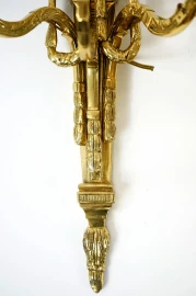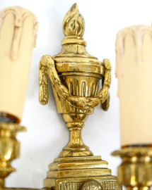 Sei appliques a tre luci stile Luigi XVI in bronzo dorato, XX secolo, con tre bracci a doppia voluta e fusto architettonico sormontato da un vaso ad urna ornato da festoni, cm h 43,5