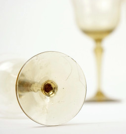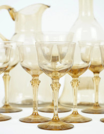 Servizio di bicchieri in vetro fumè, composto da una caraffa, una bottiglia, 14 bicchieri di dimensioni diverse, alt. max cm 28, (servizio incompleto)