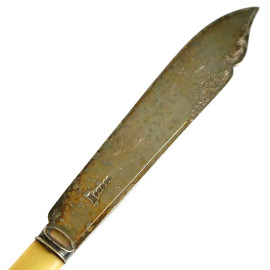 Servizio di posate da dolce in metallo argentato, composto da sei forchette e sei coltelli con decori incisi, punzone EP, entro custodia in legno